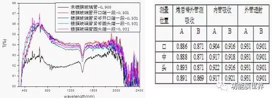 图3为太阳能集热管对比测试数据图表,如图3-A所示,为单支太阳能集热管罩玻璃不同点内表面单面镀AR膜透射曲线。其中未镀膜透射比为0.900,镀膜罩玻璃管透射比0.931之间,平均透射比增加3%。